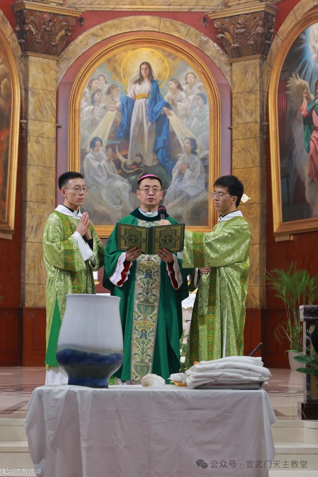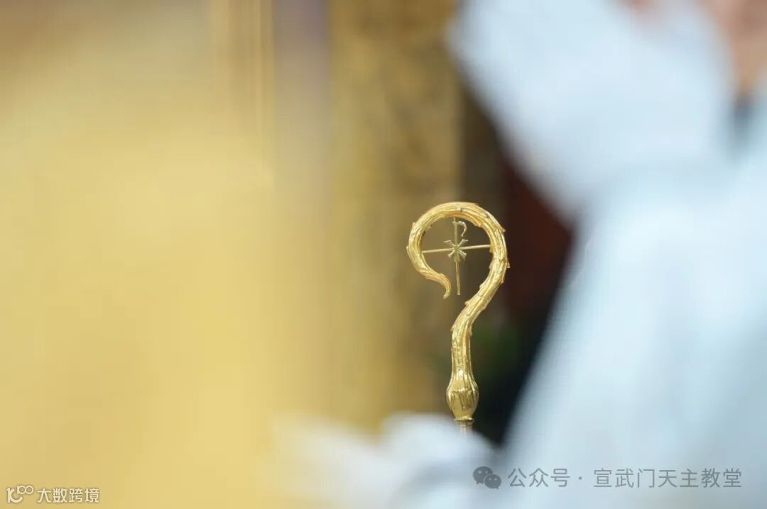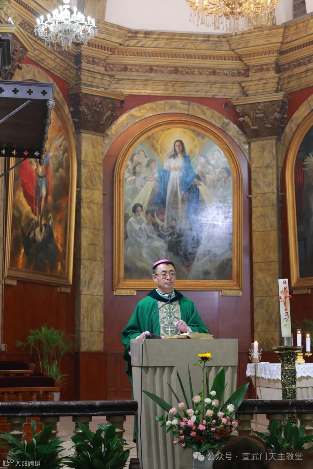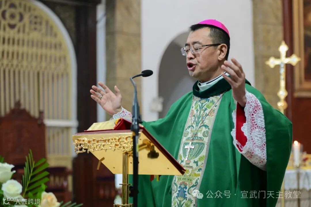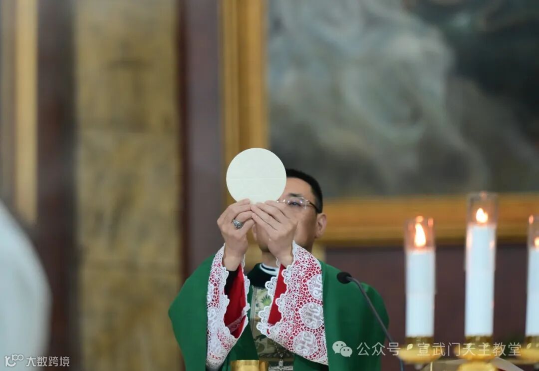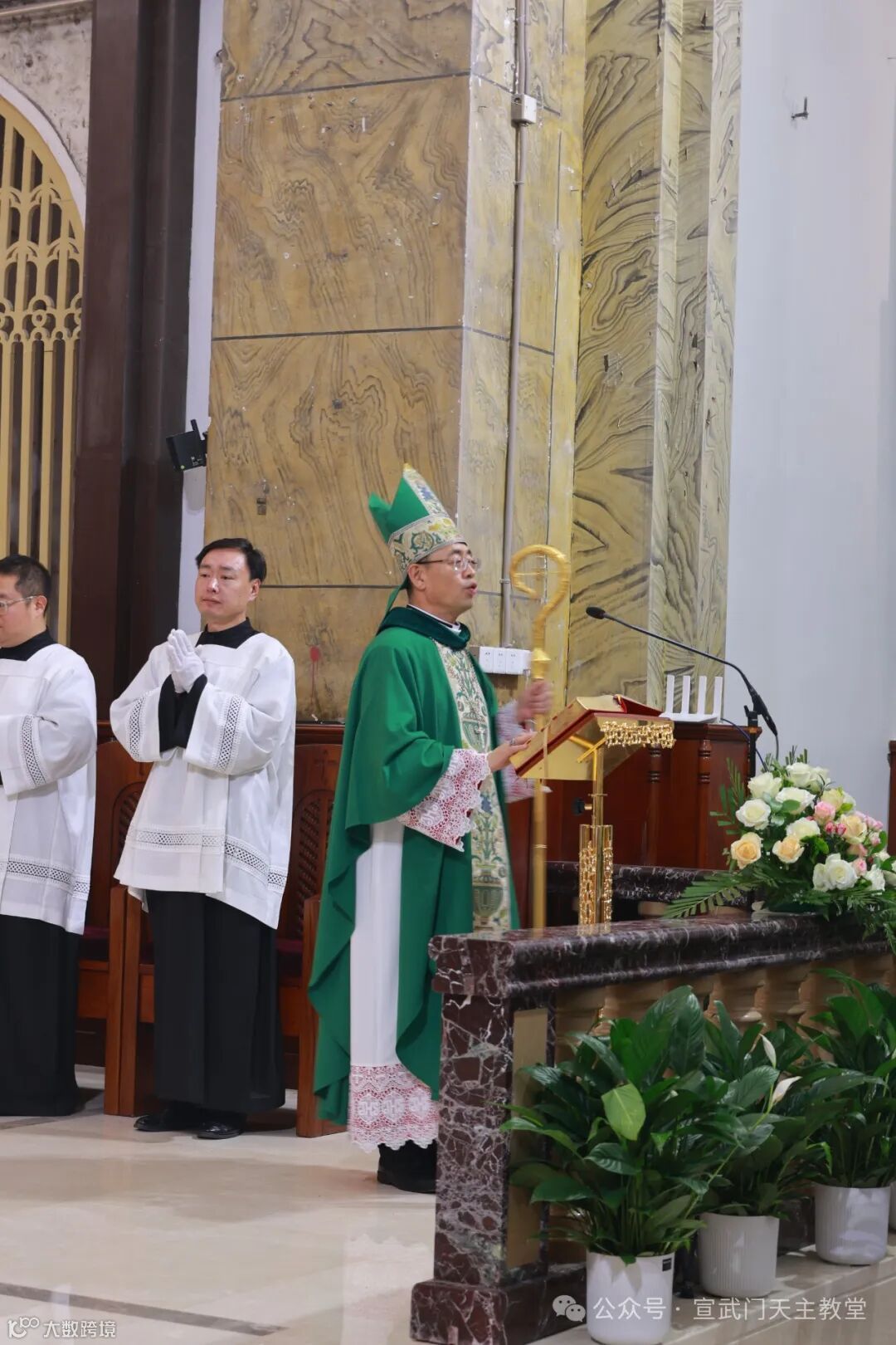 伴随着悠扬的钟声,甄雪斌主教身着深绿色的主教服,神情庄重而肃穆,手持权杖,缓缓步入圣堂,开始了他的首祭弥撒。