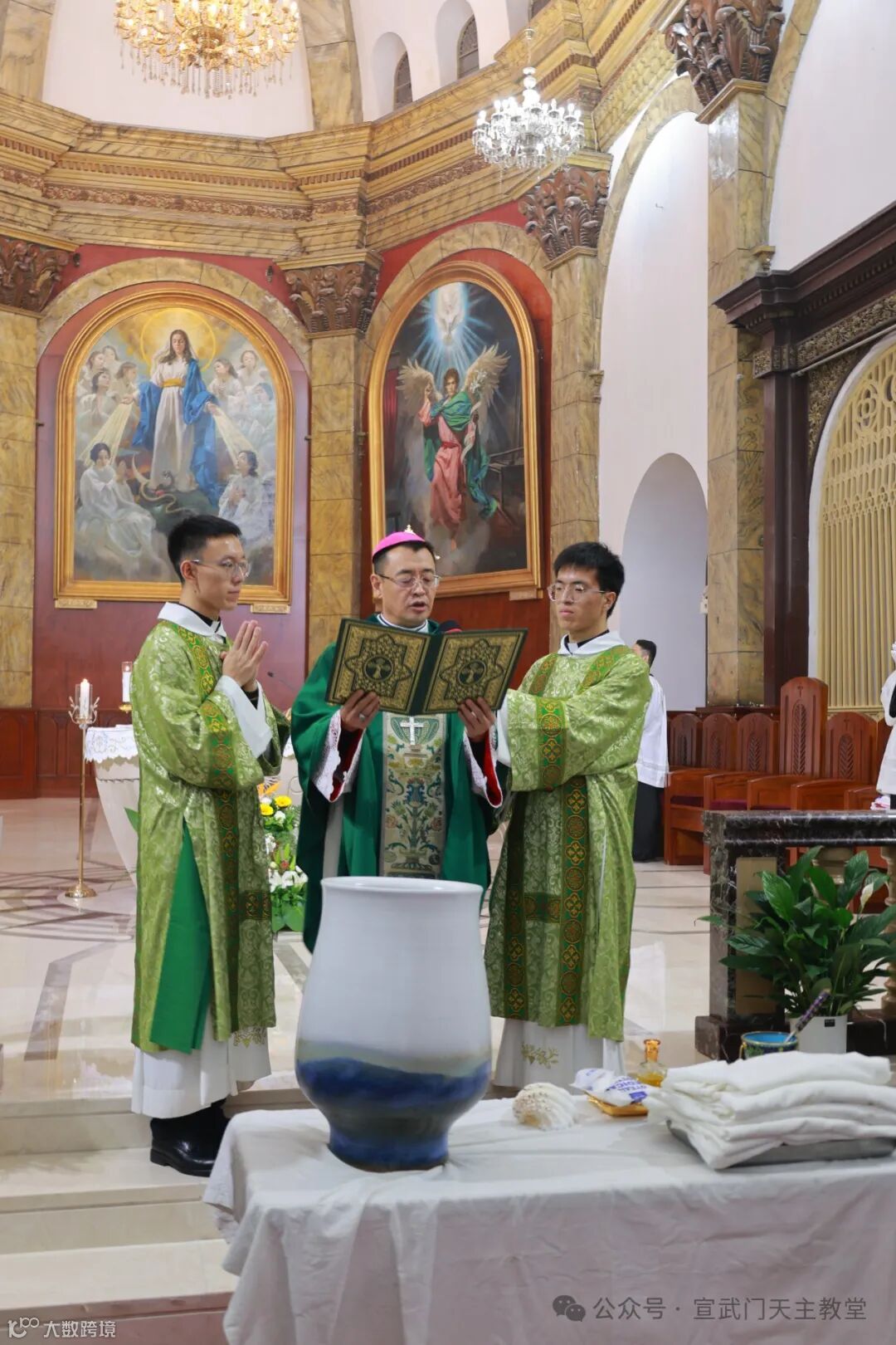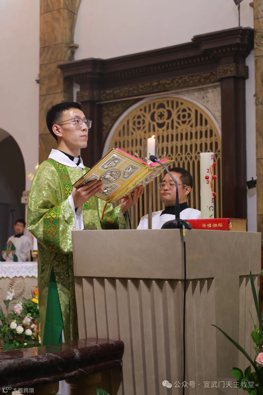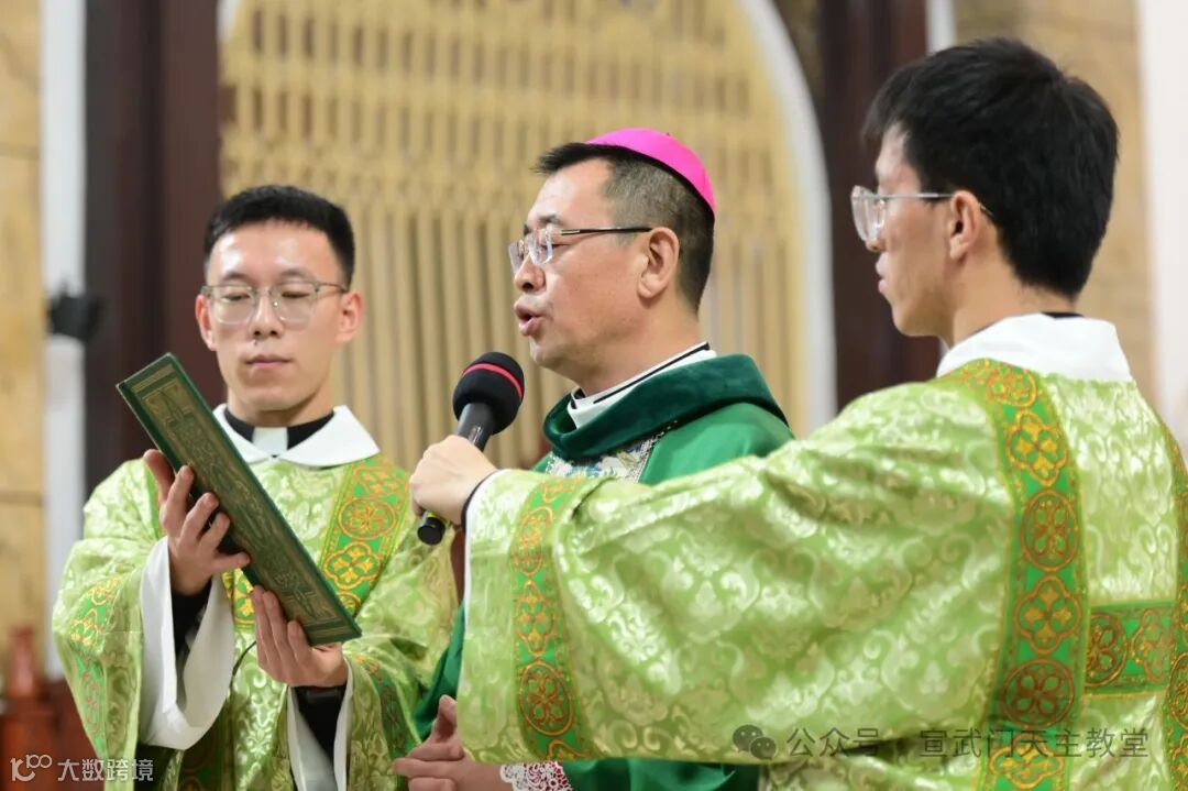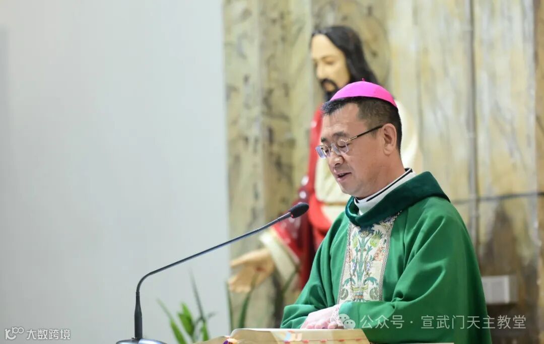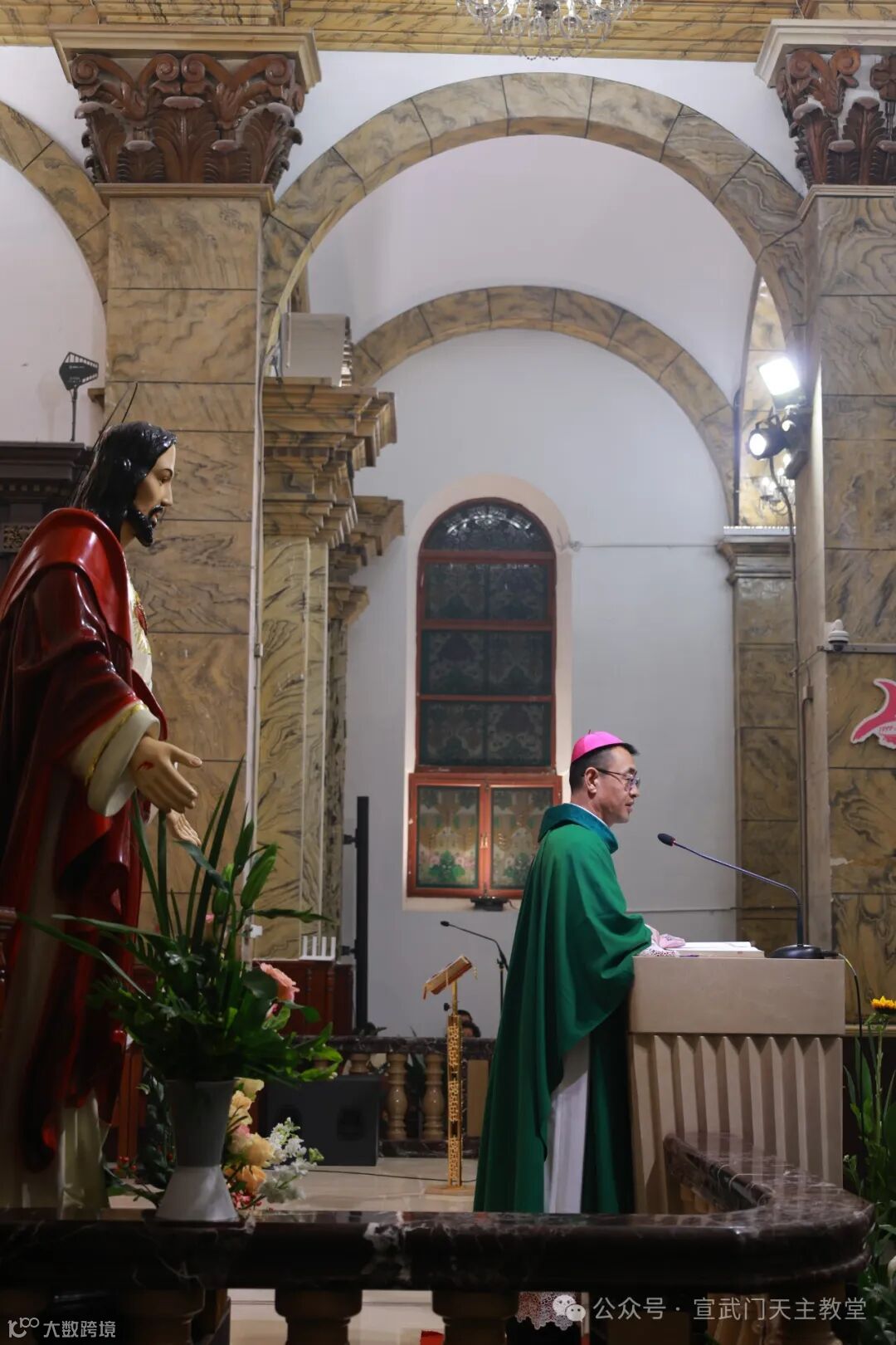伴随着悠扬的钟声,甄雪斌主教身着深绿色的主教服,神情庄重而肃穆,手持权杖,缓缓步入圣堂,开始了他的首祭弥撒。