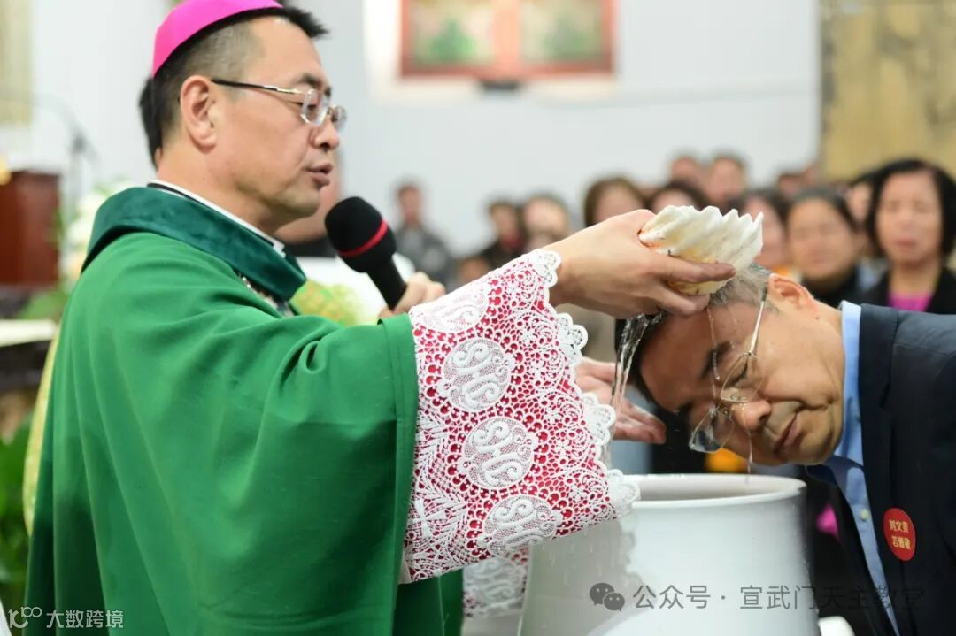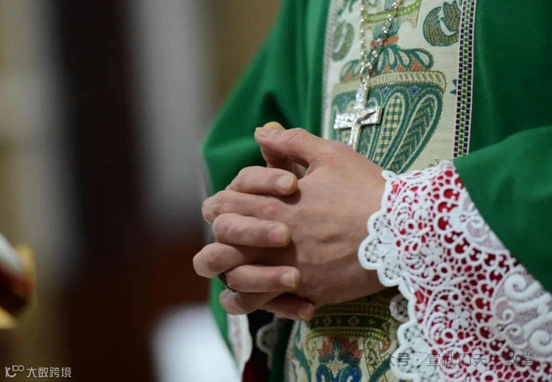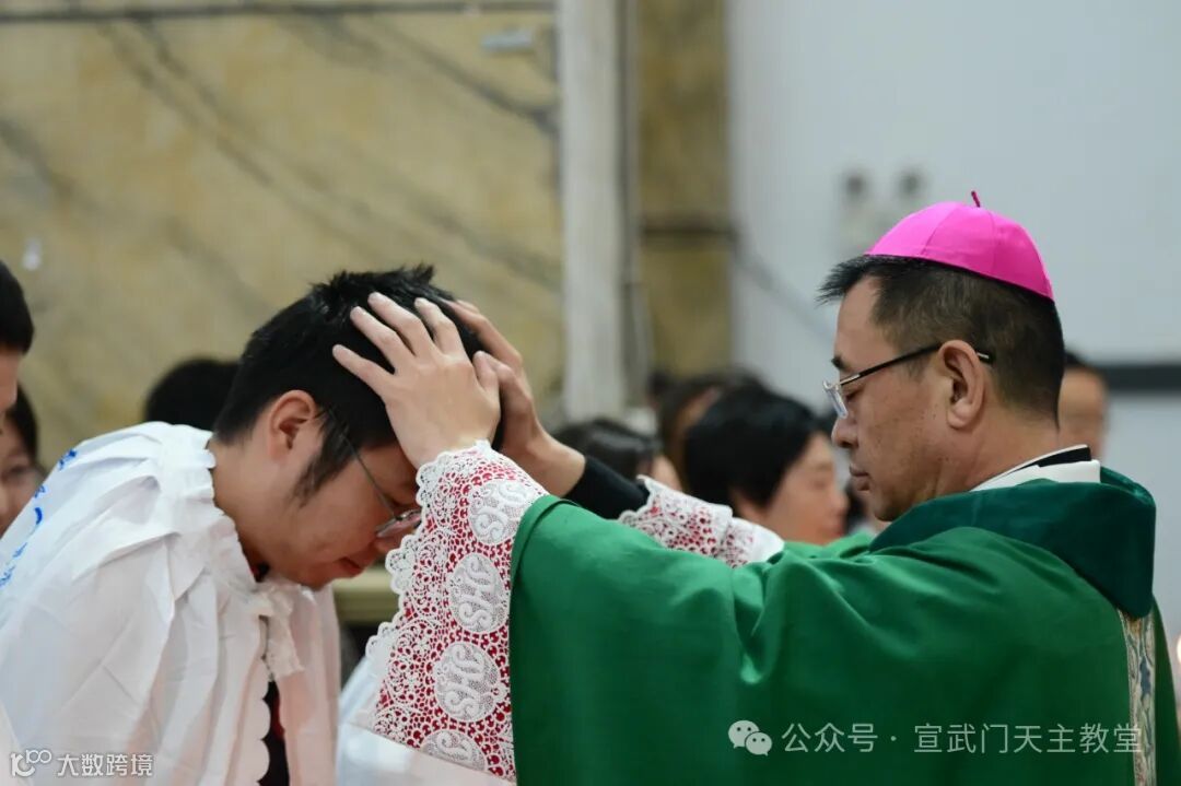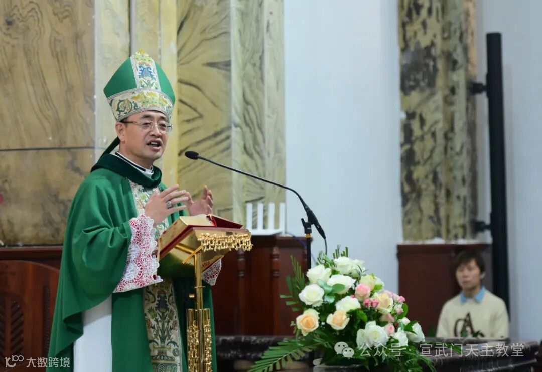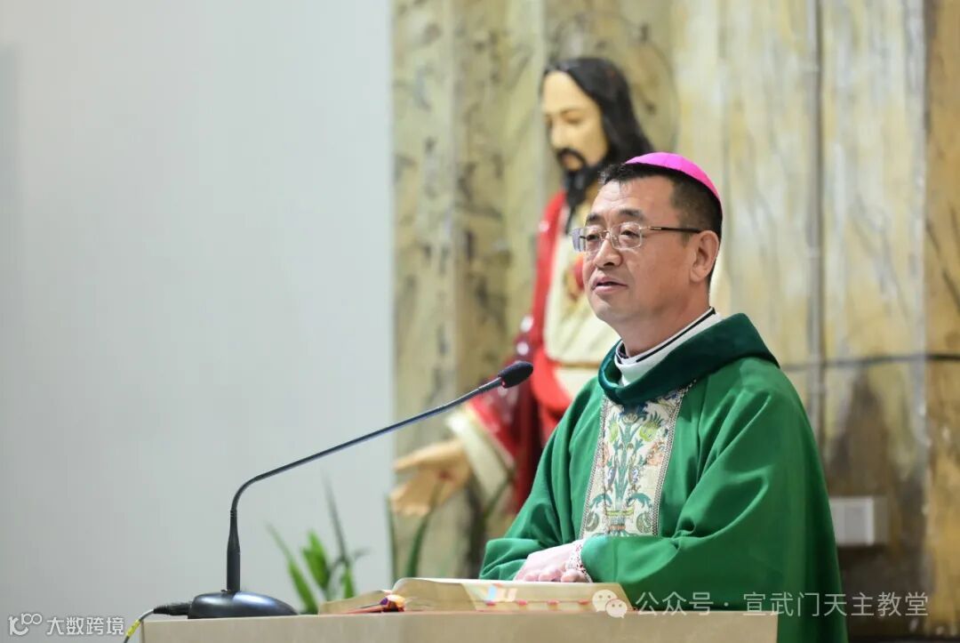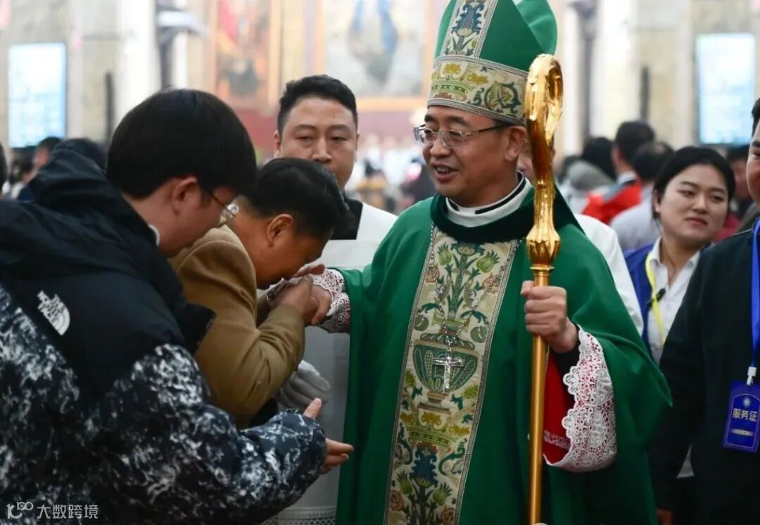 伴随着悠扬的钟声,甄雪斌主教身着深绿色的主教服,神情庄重而肃穆,手持权杖,缓缓步入圣堂,开始了他的首祭弥撒。