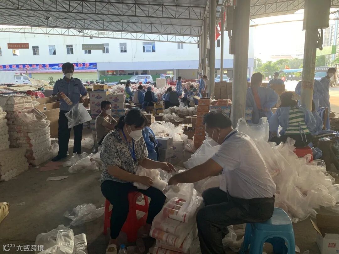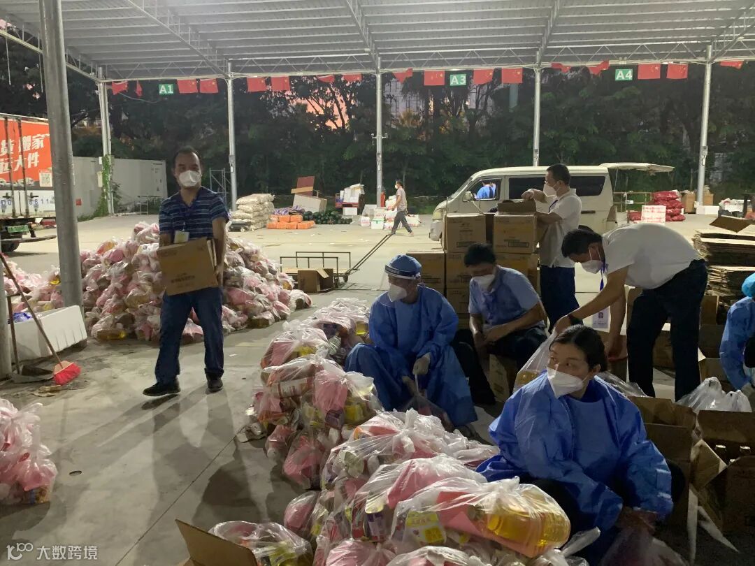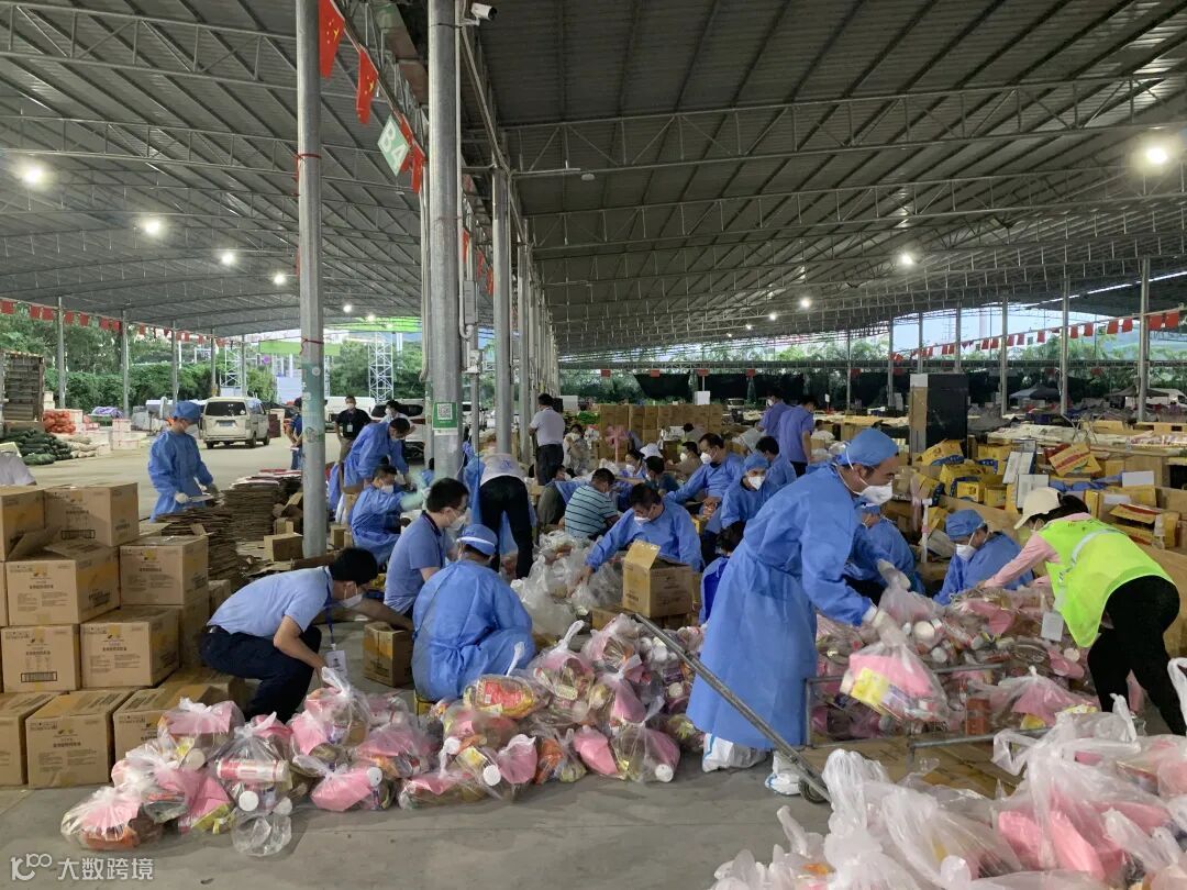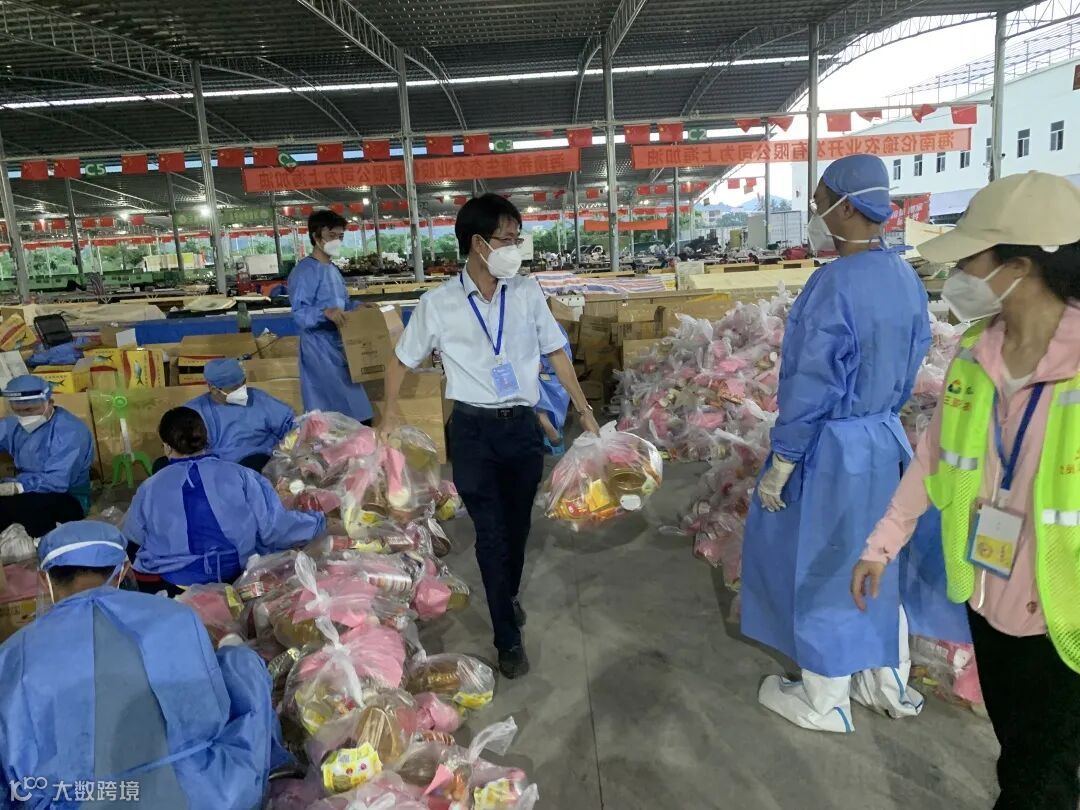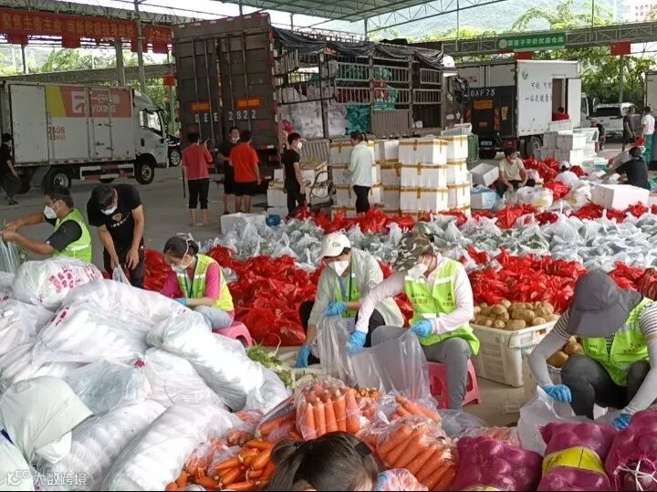后勤保供工作人员顶着炎炎烈日,将物资整理、分装后,按照订单进行打包、搬运,形成了一条高效、整齐的流水线。他们日夜兼程,确保“菜篮子”“米袋子”“果盘子”供给安全,价稳质优。