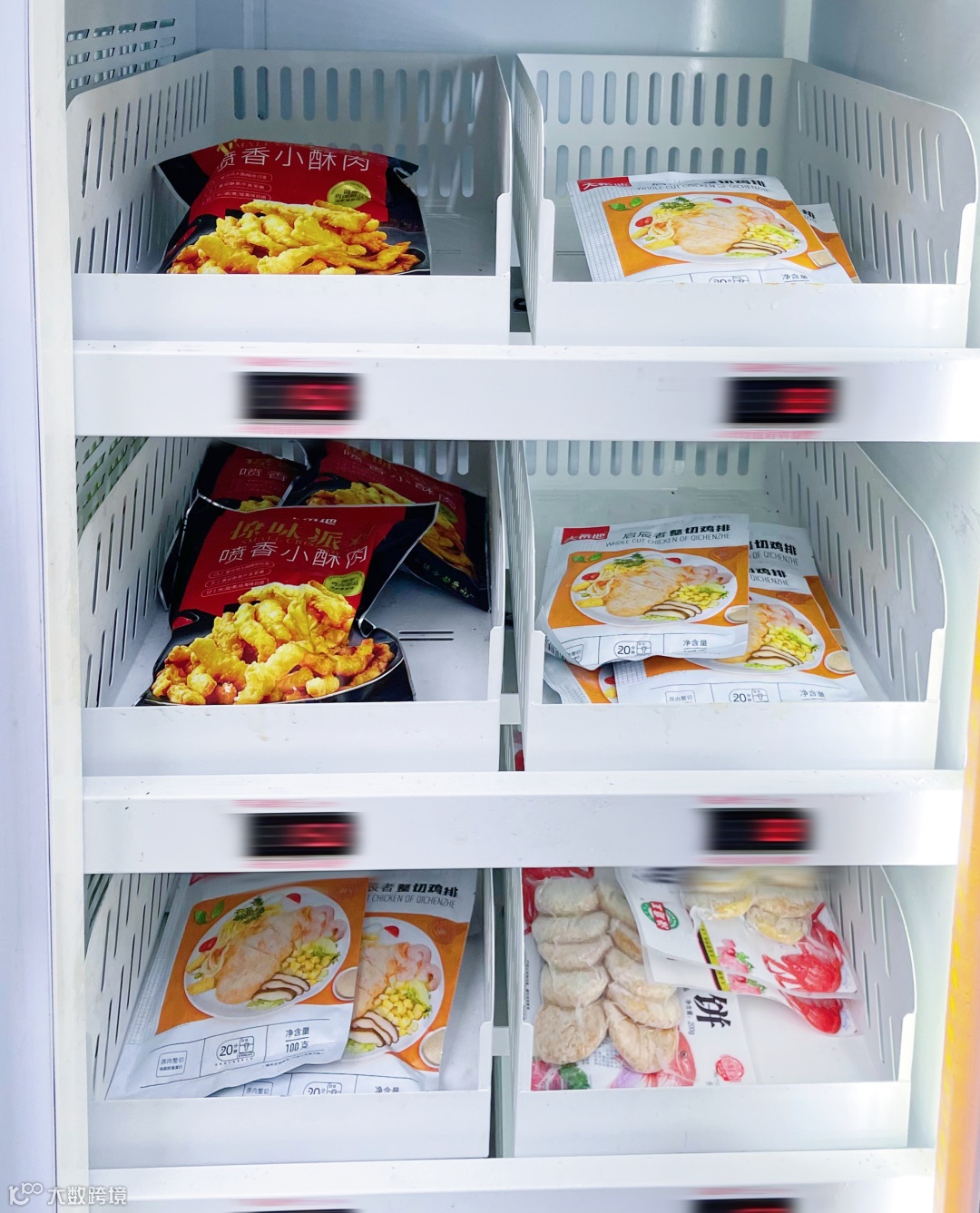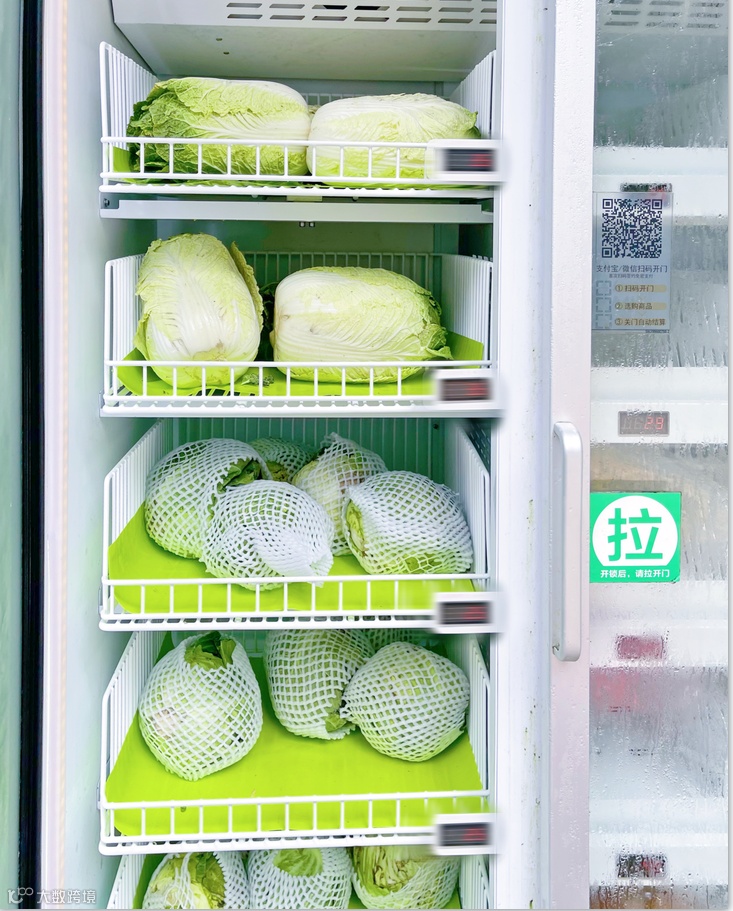 智慧冷柜外型小巧,但却“五脏俱全”:每一个柜体都分为10个小货架,整齐罗列着各式各样的速冻产品、零食饮料。但受疫情影响,货架上的小零食换成了居家必备的蔬菜和速食产品。(特殊时期,个别商品可能会出现供货不足的情况,请大家多多理解)