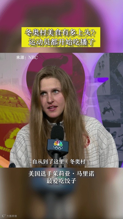 2月7日,刚刚斩获冬奥单板滑雪女子坡面障碍技巧赛亚军的美国选手茱莉亚·马里诺在接受美国全国广播公司采访时,谈到自己在冬奥村最爱的美食就是饺子。