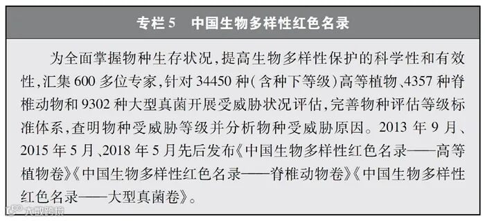 开展全国生物多样性调查与评估。大力推进生物多样性保护重大工程实施,结合自然资源调查、生态系统监测评估等工作,不断完善生物多样性调查与评估能力,首次将生物多样性指标纳入生态质量综合评价指标体系,引导地方加强生态文明建设与生物多样性保护。开展自然资源调查,包括森林、草原、水、湿地、荒漠、海洋等,建立自然资源调查评价监测制度。构建了涵盖2376个县级行政单元、样线总长超过3.4万公里的物种分布数据库,建立物种资源调查及收集信息平台,准确反映野生动植物空间分布状况。完成长江经济带、京津冀等国家战略区域180多个县级行政区生物多样性调查与评估。组织开展近海渔业资源调查,初步掌握近海渔业资源状况。陆续发布《中国植物红皮书》《中国濒危动物红皮书》《中国物种红色名录》《中国生物多样性红色名录》,基本掌握生物多样性总体情况,为加强生物多样性保护奠定了科学基础。