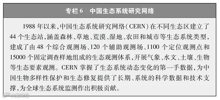完善监测观测网络。中国建立起各类生态系统、物种的监测观测网络,在生物多样性理论研究、技术示范与推广以及物种与生境保护方面发挥了重要作用,为科研、教育、科普、生产等各领域提供了多样化的信息服务与决策支持。其中,中国生态系统研究网络(CERN)、国家陆地生态系统定位观测研究网络(CTERN)涵盖所有生态系统和要素,中国生物多样性监测与研究网络(Sino BON)覆盖动物、植物、微生物等多种生物类群,中国生物多样性观测网络(China BON)构建了覆盖全国的指示物种类群观测样区。