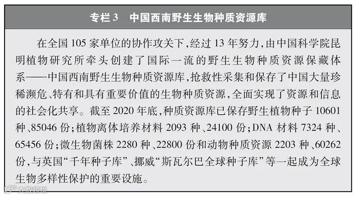 加快重要生物遗传资源收集保存和利用。中国高度重视生物资源保护,近年来在生物资源调查、收集、保存等方面取得较大进展。实施战略生物资源计划专项,完善生物资源收集收藏平台,建立种质资源创新平台、遗传资源衍生库和天然化合物转化平台,持续加强野生生物资源保护和利用。实施一批种质资源保护和育种创新项目,截至2020年底,形成了以国家作物种质长期库及其复份库为核心、10座中期库与43个种质圃为支撑的国家作物种质资源保护体系,建立了199个国家级畜禽遗传资源保种场(区、库),为90%以上的国家级畜禽遗传资源保护名录品种建立了国家级保种单位,长期保存作物种质资源52万余份、畜禽遗传资源96万份。建设99个国家级林木种质资源保存库,以及新疆、山东2个国家级林草种质资源设施保存库国家分库,保存林木种质资源4.7万份。建设31个药用植物种质资源保存圃和2个种质资源库,保存种子种苗1.2万多份。