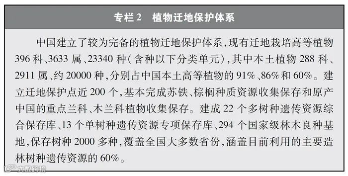 中国持续加大迁地保护力度,系统实施濒危物种拯救工程,生物遗传资源的收集保存水平显著提高,迁地保护体系日趋完善,成为就地保护的有效补充,多种濒危野生动植物得到保护和恢复。