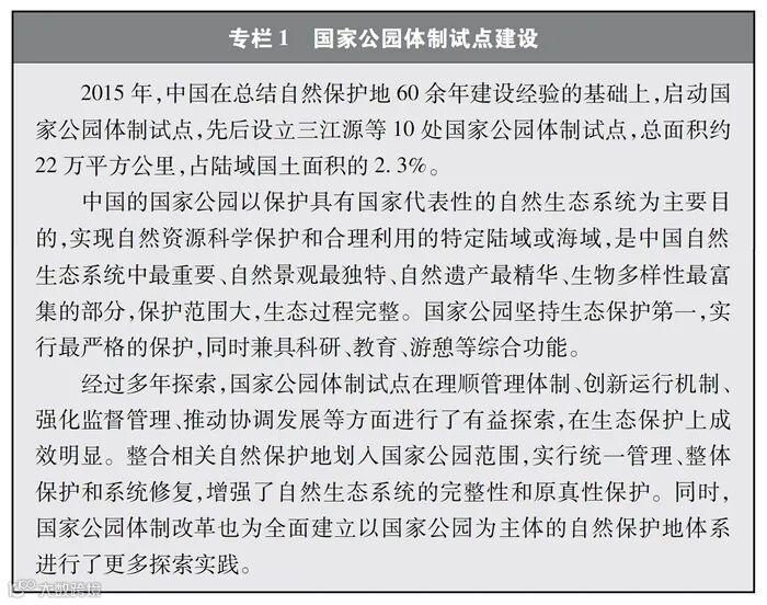 中国不断推进自然保护地建设,启动国家公园体制试点,构建以国家公园为主体的自然保护地体系,率先在国际上提出和实施生态保护红线制度,明确了生物多样性保护优先区域,保护了重要自然生态系统和生物资源,在维护重要物种栖息地方面发挥了积极作用。