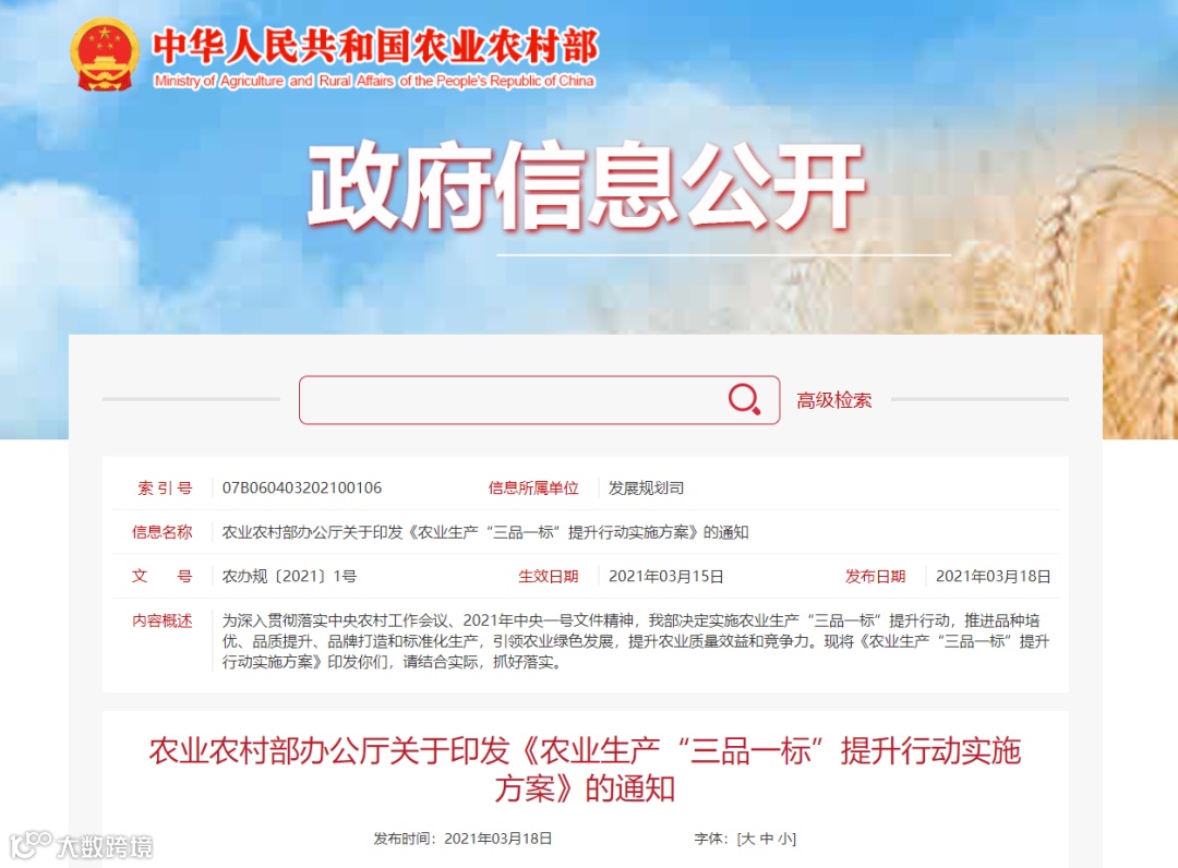 为深入贯彻落实中央农村工作会议、2021年中央一号文件精神,农业农村部决定实施农业生产“三品一标”提升行动,印发《农业生产“三品一标”提升行动实施方案》 。