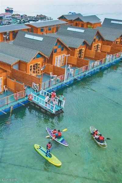 图❶在陵水黎族自治县疍家渔排海上共享渔庄,游客体验桨板等游玩项目。