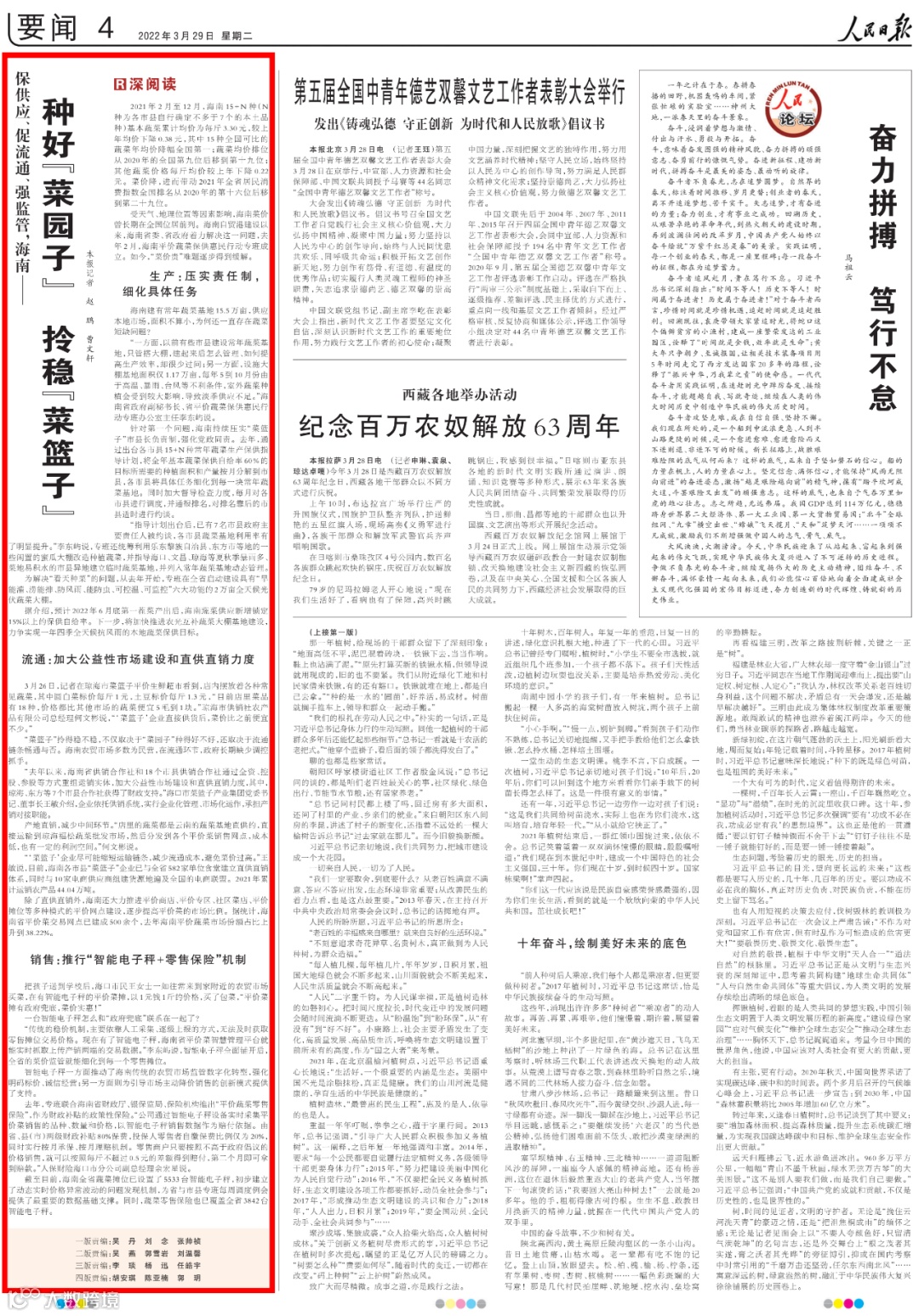 3月29日,人民日报要闻四版刊发文章《保供应、促流通、强监管,海南——种好“菜园子” 拎稳“菜篮子”》(深阅读),版面图及全文如下: