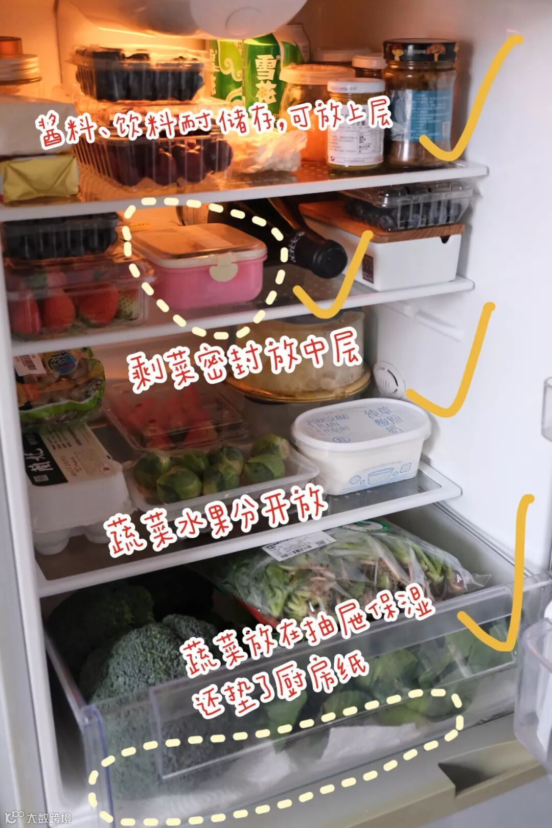 分区存放,不仅仅是为了更好地利用冰箱资源,还能避免交叉感染。下面是一位优秀模范生的作业,真是无比舒适: