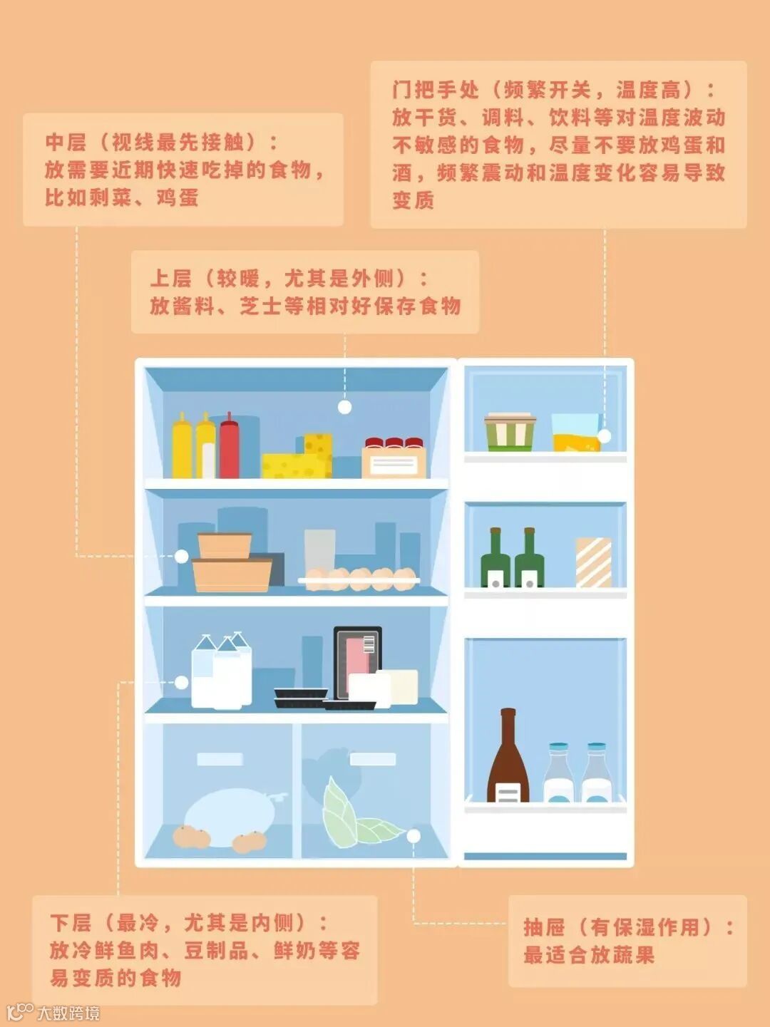 另一方面,冰箱内部的温度分布并不均匀,根据制冷原理,下比上冷,内比外冷,这就形成了不同温度区,适合囤不同食材。