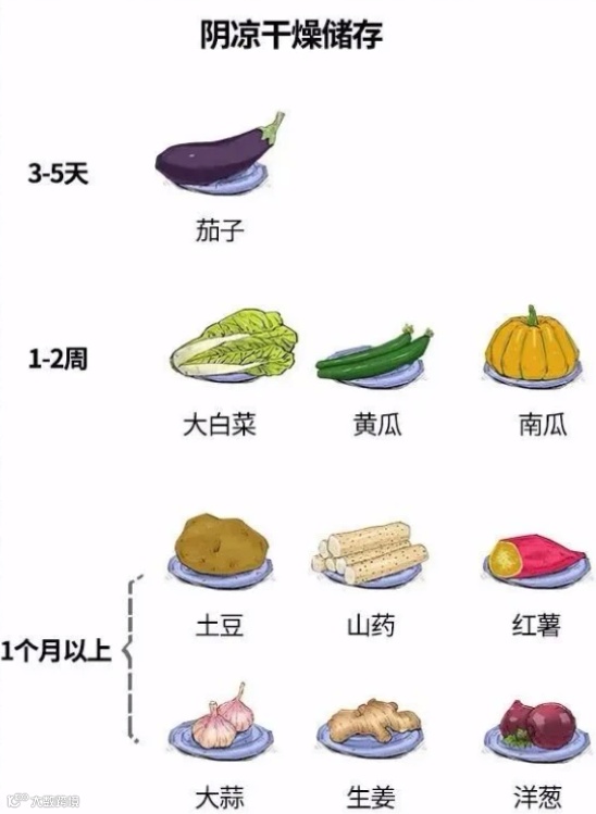 有些食材适合干燥保存,在常温放着也比进冰箱好,比如没切的洋葱、蒜头、根茎类蔬菜(土豆、红薯、南瓜、胡萝卜、白萝卜)等等。总体上来说,水分越少的蔬菜越耐储存。下面是各类蔬菜的保鲜期↓↓↓