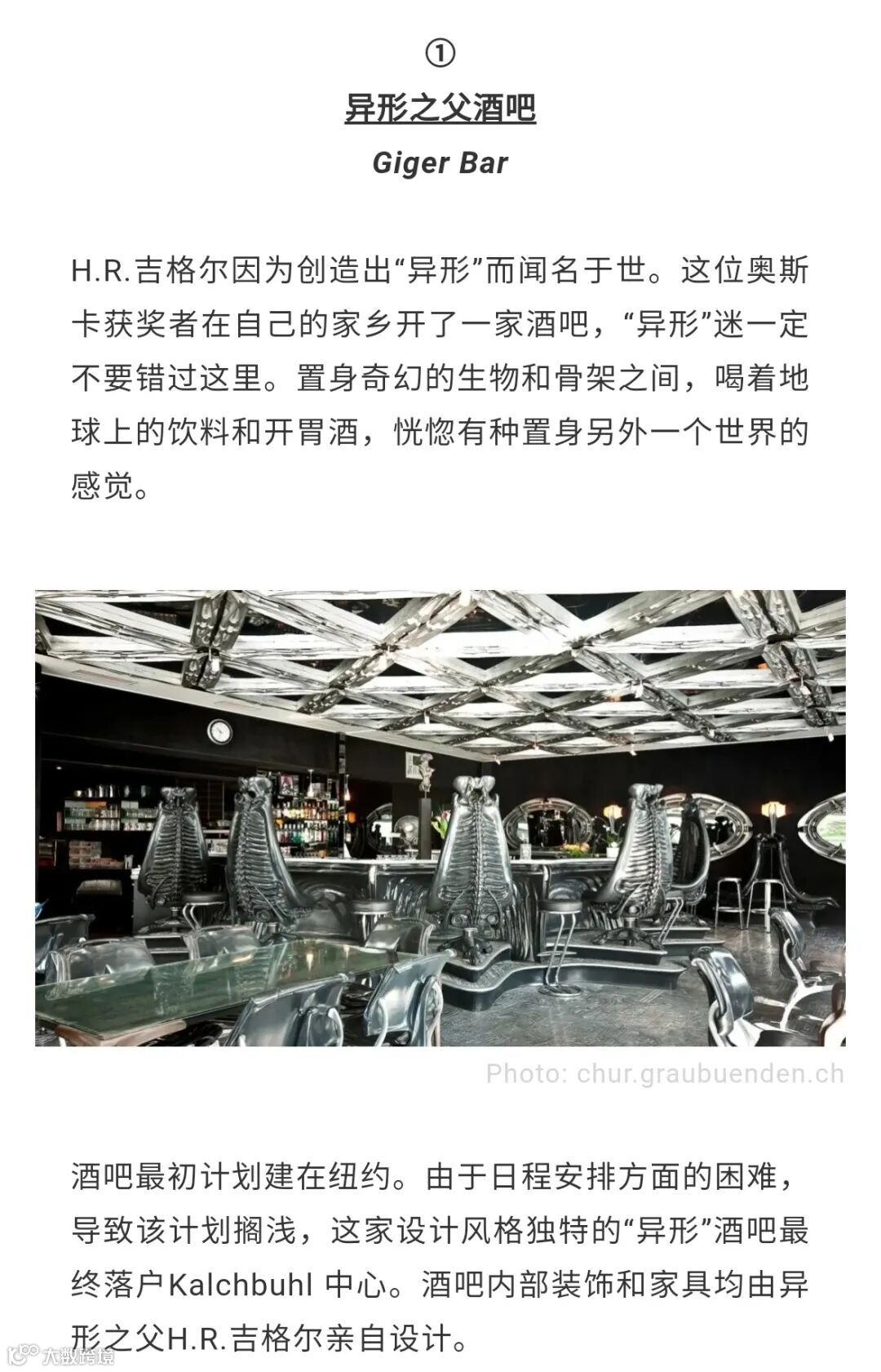 H.R.吉格尔为雷德利·斯科特导演的影片《异形》设计了其中的“异形”,因此获得1980年奥斯卡奖。吉格尔不仅享誉电影界,还在音乐界享有盛誉,为多支重要的重金属乐队设计艺术唱片封面。在吉格尔的家乡库尔,可以在不同的地方更深入地了解“异形之父”H.R.吉格尔。