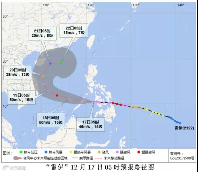 预计南沙群岛附近海面,17日白天风力10~11级、阵风12~13级;17日夜间~18日增大到14~15级、阵风16~17级,其中“雷伊”中心经过的附近海面有旋转风14~16级、阵风可达17级及以上;19日风力逐渐减弱到8~9级、阵风10级;20日~21日继续减弱到6~7级、阵风8级。