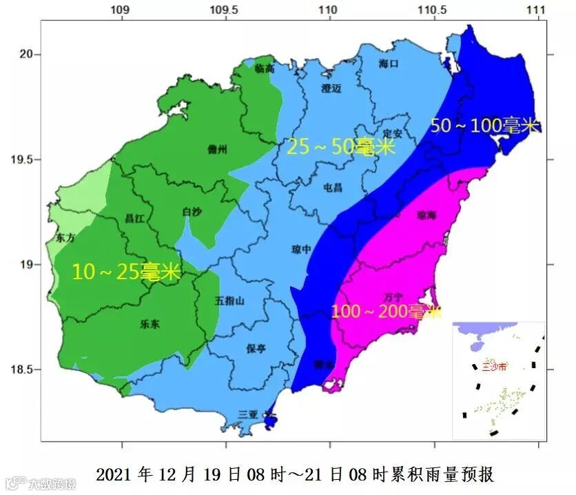 预计,12月19日08时~21日08时各地累积雨量:琼海、万宁100~200毫米;文昌、陵水50~100毫米;海口、临高、澄迈、定安、屯昌、琼中、五指山、保亭和三亚等市县25~50毫米;其余市县10~25毫米。