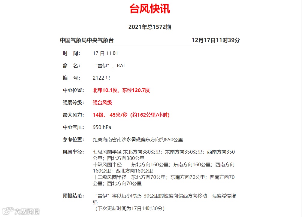 海南省气象局2021年12月17日06时30分继续发布台风三级预警。