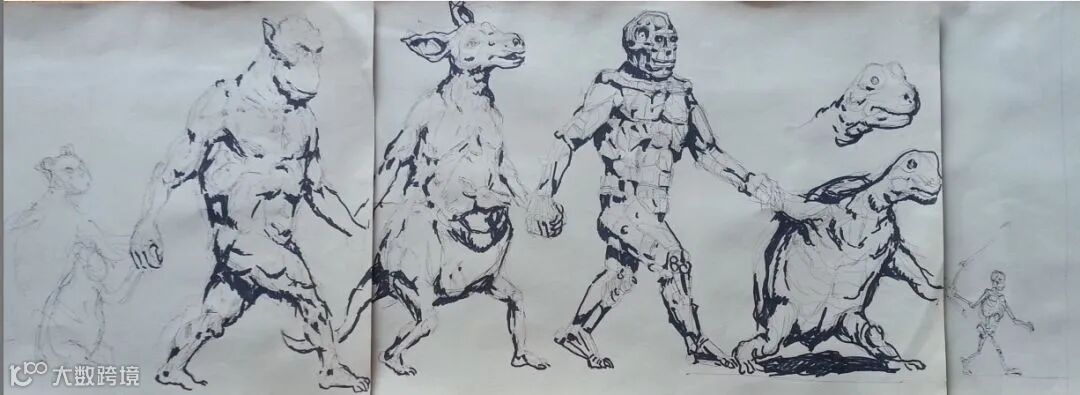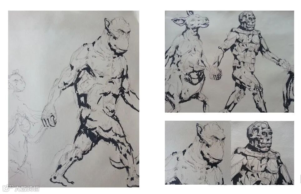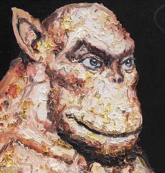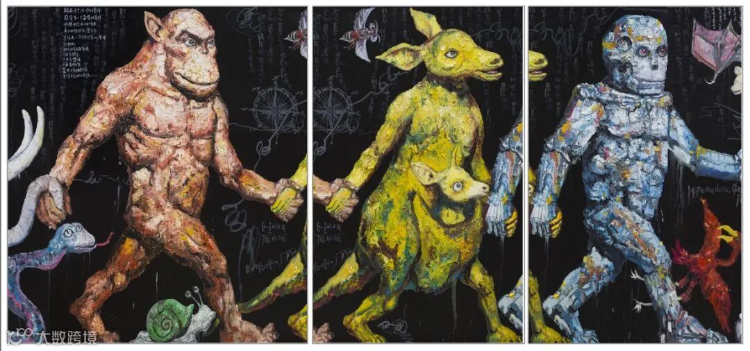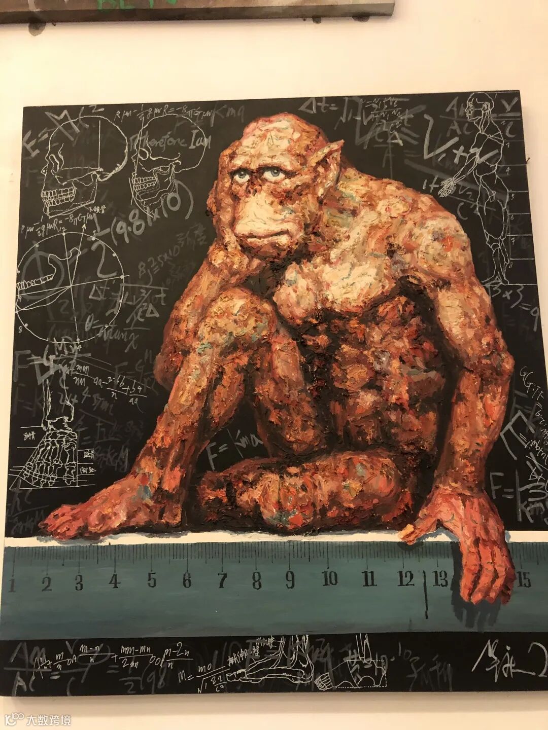 在中间突出的位置有猩猩的形象,这是最接近人类的生物,在画中我把祂作为人类的象征。陪伴祂的是人创造出的自己的复制品,机器人,有生命的和人工智慧的走在一起。