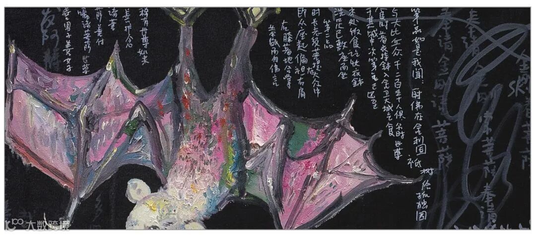 大面积的金刚经贯穿整体画面。象征宇宙生命的某种永恒笃定的宿命。