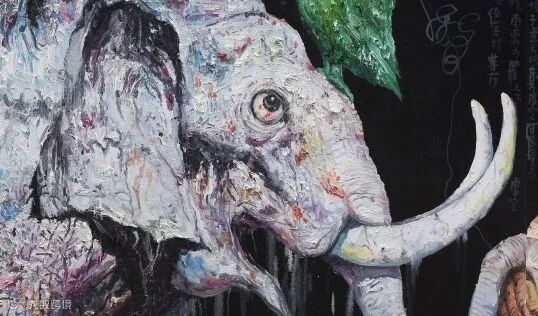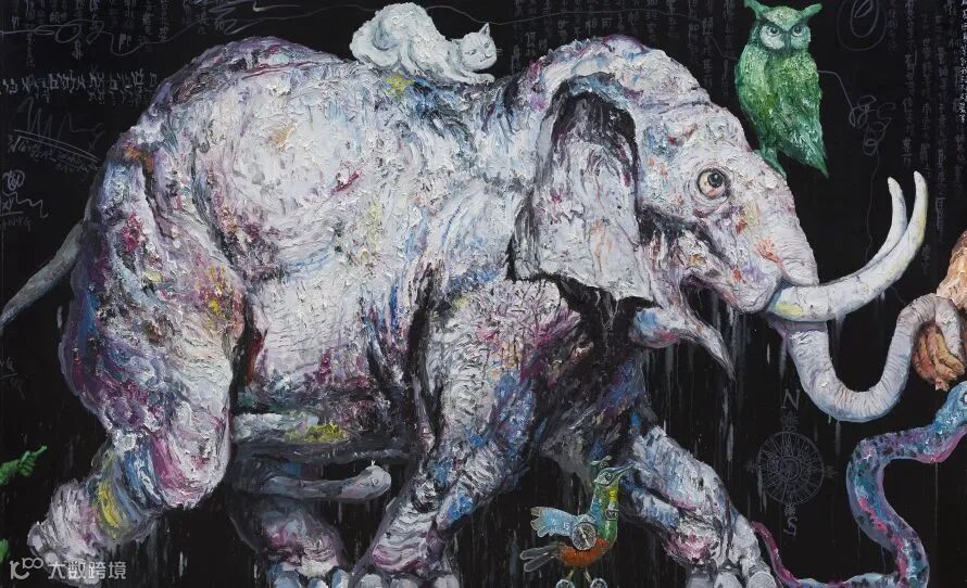 巨大的白象是吉祥物,也和机械鸟走在了一起,有生命的和无生命的,一大一小,使之浮现对比。