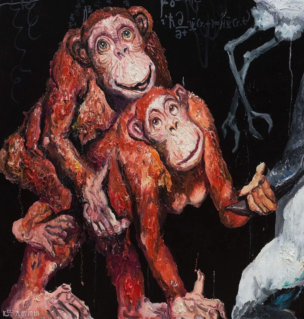 我在画的左边(面对着画面站着算)画了一对交配的猩猩,以此展现生命的起源。