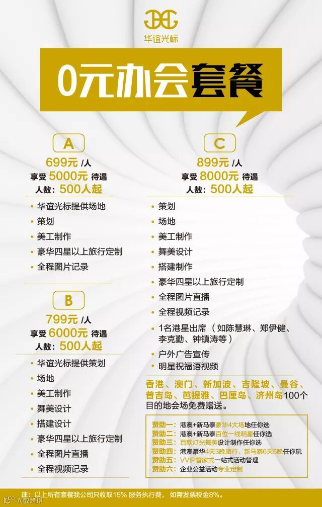 华谊光标从事会议活动策划10年有余,现在我们推出会议+旅行+音乐会模式. 摆脱烦躁的传统会议感受,与活动目的地联合赞助补贴会议基本费用,同时邀约明星出席提高会议规格. 让主办方有效节约会议成本65%以上,让参会者感受丰富的会议内容,达成完美的体验效果.