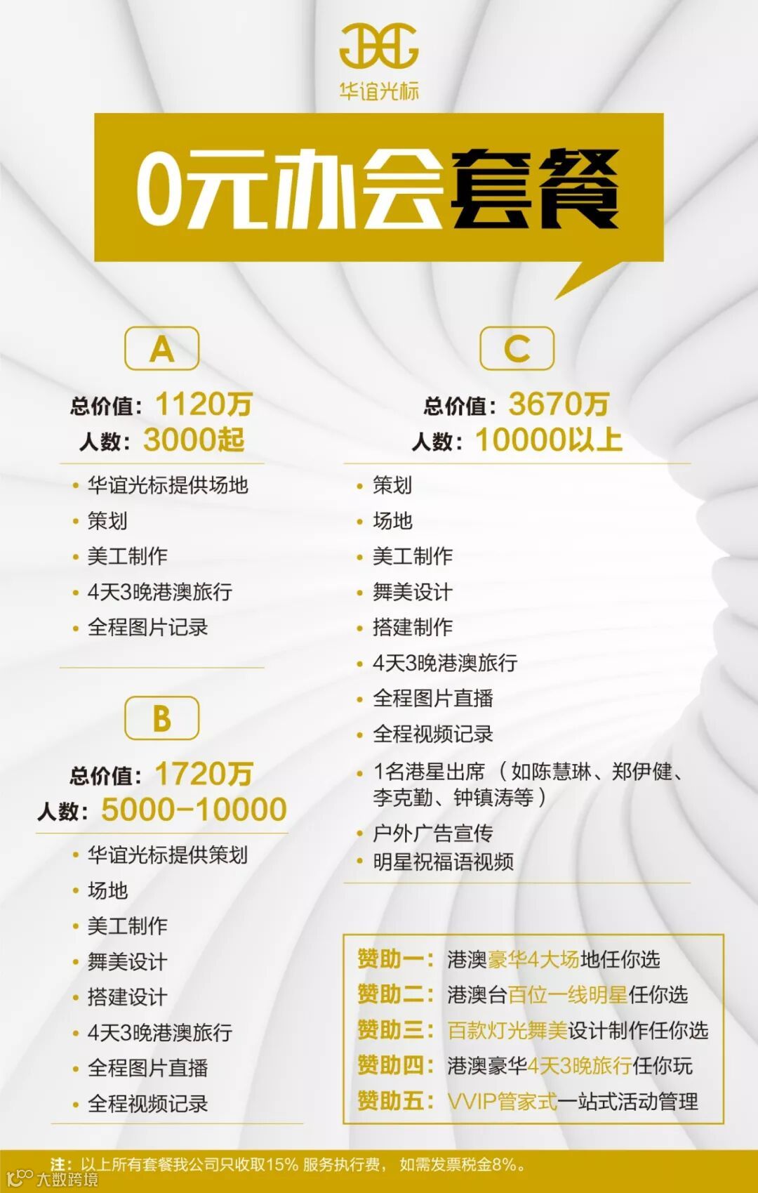 华谊光标从事会议活动策划10年有余,现在我们推出会议+旅行+音乐会模式. 摆脱烦躁的传统会议感受,与活动目的地联合赞助补贴会议基本费用,同时邀约明星出席提高会议规格. 让主办方有效节约会议成本65%以上,让参会者感受丰富的会议内容,达成完美的体验效果.
