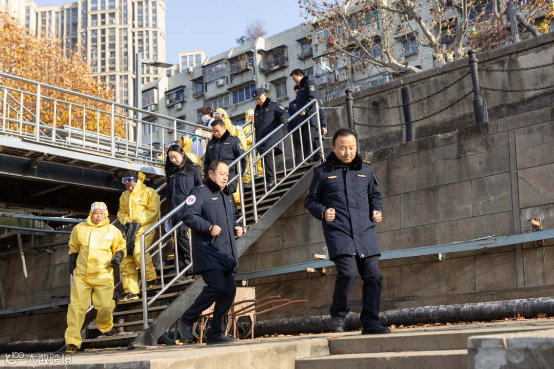 本次演练紧扣新版应急预案核心框架,结合水厂实际运行风险,针对性设置高锰酸钾泄漏场景,补充完善水源地风险防控链条,重点检验风险预警、现场管控、污染处置、水质监测等全流程响应能力。演练启动后,硚口区分局与宗关水厂迅速启动应急响应,成立应急指挥部及现场警戒组、污染处置组、应急监测组、应急保障组,各小组协同配合、有序开展处置。现场警戒组快速划定50米安全管控区域,设置警戒线并堆筑沙袋拦截堤,防止污染扩散;污染处置组穿戴防护装备,对泄漏源进行封堵,用吸附棉收集泄漏液,并将污染沙土、吸附废料分类装入密封桶规范转运;应急监测组在水源地及上下游布设监测断面,实时监测pH值、电导率、溶解氧等指标并定期报送数据,为决策提供支撑;应急保障组同步开展舆情引导和信息发布,及时通报处置进展,避免引发社会恐慌。全体参演人员顶住低温严寒压力,反应迅速、操作规范,以高度的责任感和专业素养圆满完成各项演练任务。