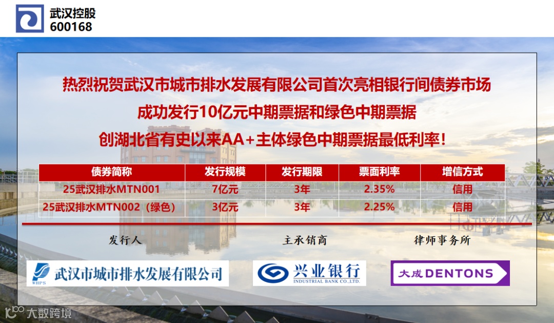 9月1日,武汉控股公司全资子公司——武汉市城市排水发展有限公司(以下简称“排水公司”)在银行间市场完成了具有里程碑意义的首次亮相,成功发行中期票据(债券简称“25武汉排水MTN001”)和绿色中期票据(债券简称“25武汉排水MTN002”),发行总金额达10亿元,期限3年,票面利率分别为2.35%和2.25%,2期加权利率2.32%。其中,绿色中期票据创湖北省有史以来AA+主体最低利率。此次发行标志着该公司在市场化融资道路上迈出了坚实的一步,也为武汉城市基础设施建设注入了新活力。