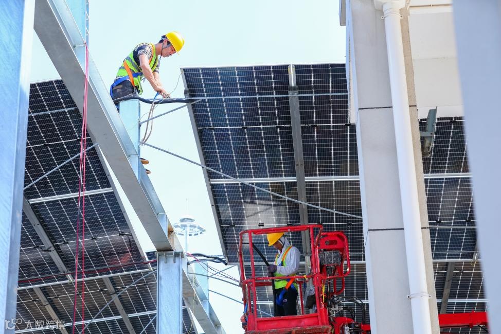 针对索结构易振动的特点,该项目采用了“刚柔承载”设计理念,构建了“组件檩条刚性整体、索结构柔性支撑”承载体系,创新地在柔性钢索上安装刚性檩条,组件固定在檩条上,降低了因边框受力过大而导致的组件隐裂风险;污水厂地下管线密集且构筑物形式不一,该项目融合现有构筑物特点,采用多种基础结构型式,可有效避免光伏支架基础与地下管线、水池等设施的位置冲突。