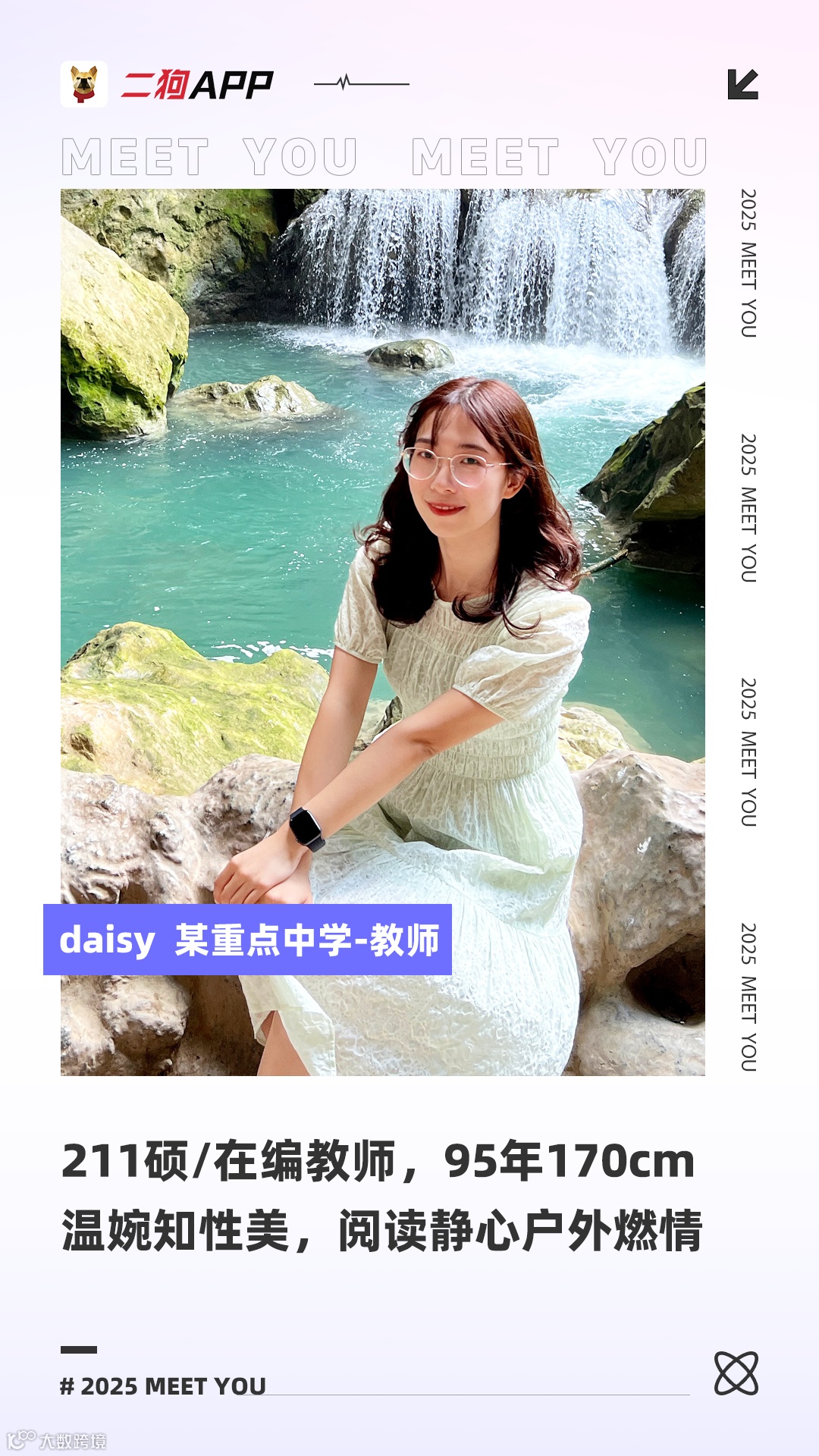 善解人意,谦虚谨慎,过去一直在当乖女儿,但内心有自己的棱角、主张和想法。待人真诚,道德标准高,追求意义感,在工作、情感恋爱甚至是生活方式上对自我要求都比较严格。希望能遇到同频的男生。