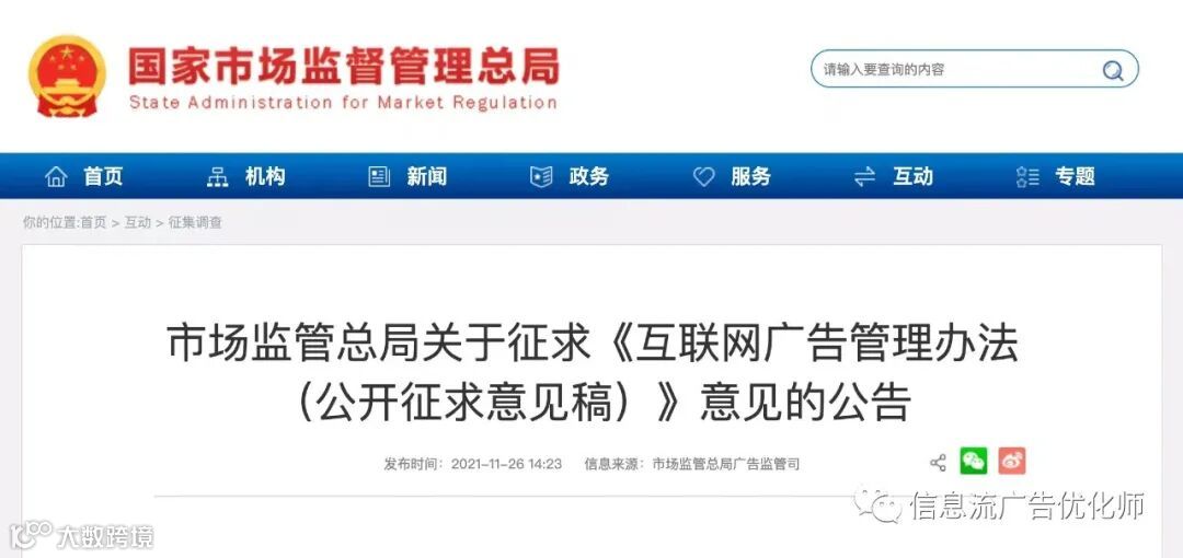 11月26日,国家市场监管总局网站发布公告称,根据《中华人民共和国广告法》等法律,市场监管总局在修订《互联网广告管理暂行办法》的基础上,起草了《互联网广告管理办法(公开征求意见稿)》。