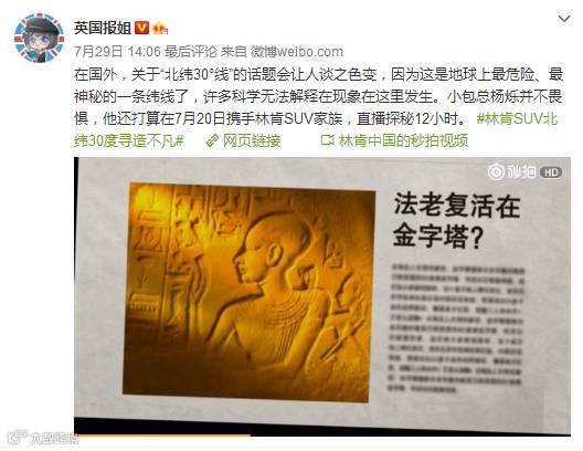 2017年7月,腾讯新闻联手林肯中国共同打造“林肯全系豪华SUV 北纬30°全球探秘12小时直播”活动。此次活动由“小包总”杨烁担当探秘大使,7月20日当天腾讯直播12小时不间断,邀请全球观众跟随林肯SUV身临其境地观看与体验长达12小时的全球探秘之旅。
