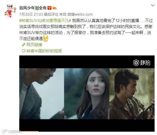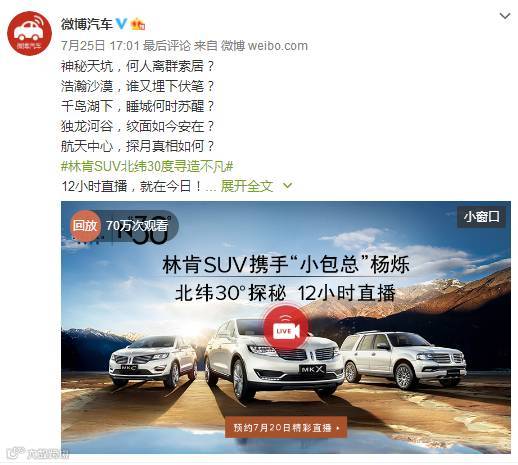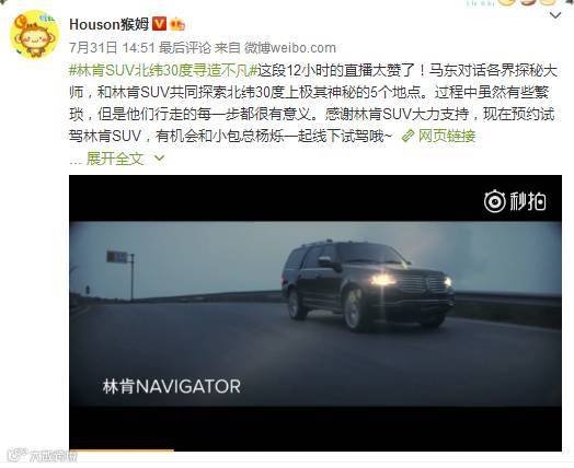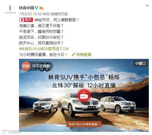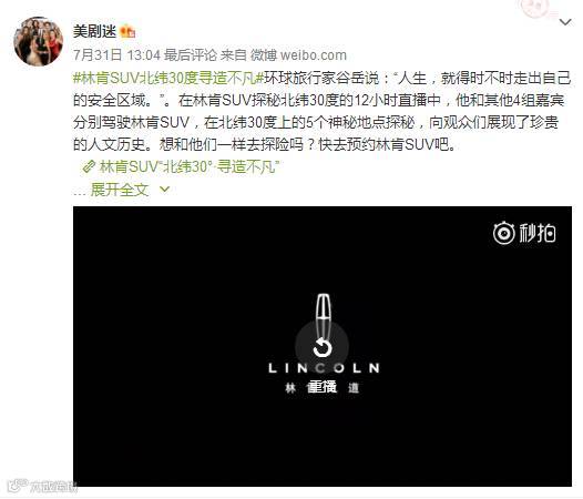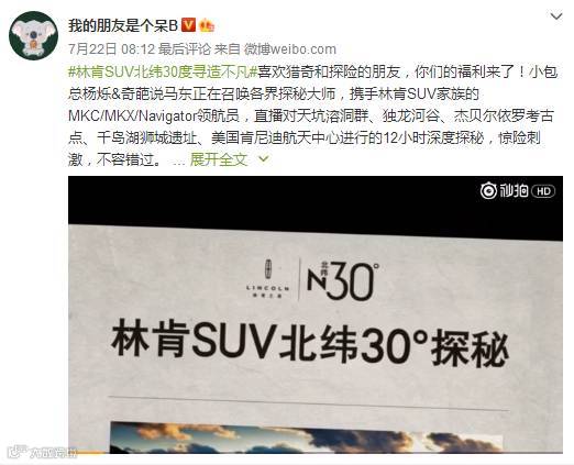 此外,林肯设立试驾专享北纬30°特别定制旅行礼包,并借助明星红人“小包总”@杨烁的人气,开展粉丝福利——9月与“小包总”同行探秘北纬30°的机会!通过线上各领域KOL进行活动推广,达到宣传的目的。