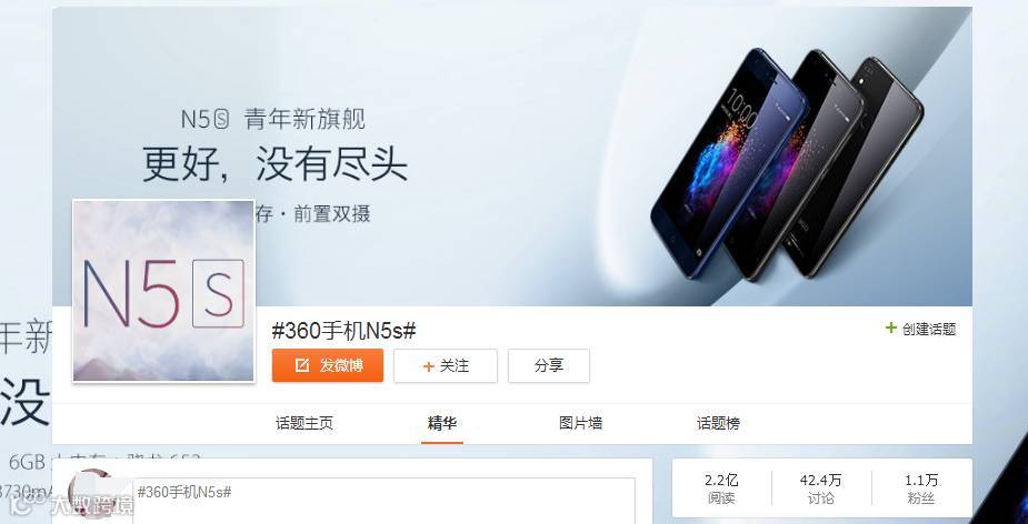 话题#360手机N5s#累计阅读2.2亿,讨论42.5万,粉丝1.1万(部分效果来自于全网投放)