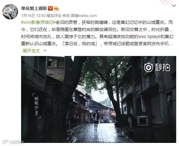 vivo官方微博同步发布一支富有情怀的系列寻城纪录片《日落重庆》,其中vivoXplay6记录下了许多特别的瞬间,用满腔文艺将城市点燃,宣传vivo“用影像记录和改变世界”的理念。