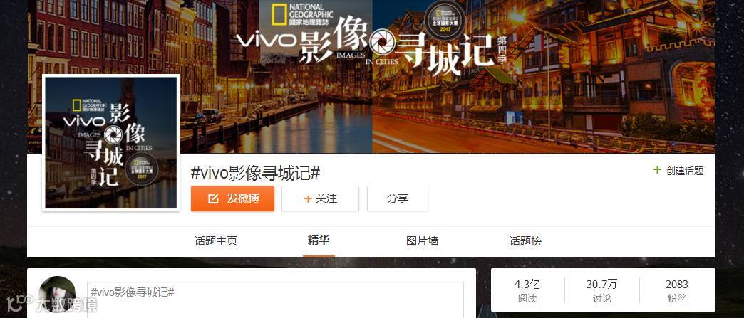 vivo选用年轻群体覆盖较广的微博平台进行活动推广,热门话题达到了4.3亿的阅读量,30.7万讨论,2083位粉丝关注。