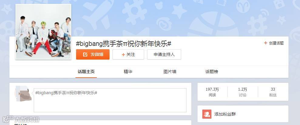 话题 #bigbang携手茶π祝你新年快乐#累计阅读197.3万,讨论1.2万(部分效果来自于全网投放)