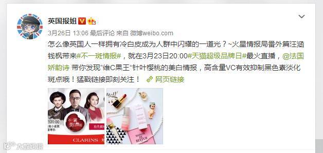 与此同时,微博、优酷、爱奇艺、腾讯等各大视频网站同步上线广告宣传综艺节目:《美白不一斑 情报等你领》