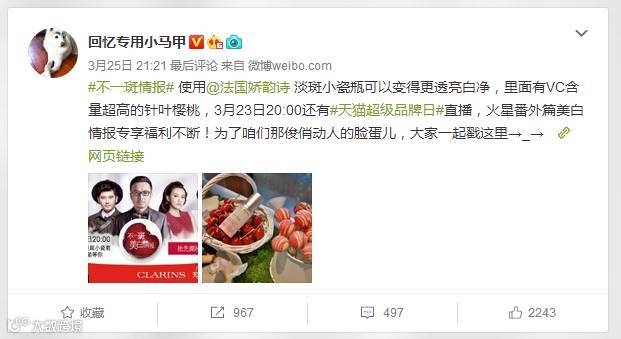 娇韵诗的线上营销一向“财大气粗”,此次新品的推广借助节点,并在名人综艺的效果推动下,通过粉丝互动追捧以及话题传播,达到了很好的推广效果。