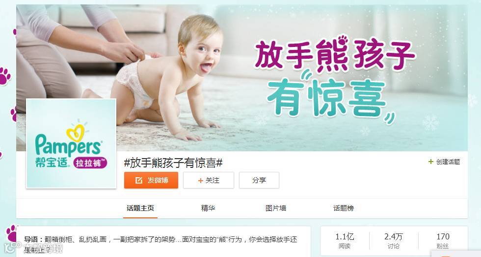 话题#放手熊孩子有惊喜#累计阅读1.1亿,讨论2.4万,粉丝170(部分效果来自于全网投放)