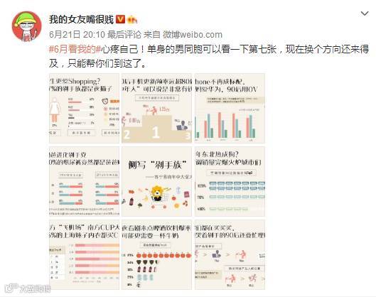 苏宁易购通过用户画像,生动有趣的表达现代70、80、90消费差异,并选取萌宠笑话类kol如“我的女友嘴很贱”、“我的朋友是个呆B”等进行话题推广,此类账号在微博平台活跃度较高,粉丝多为年轻人,能达到更好的活动推广效果: