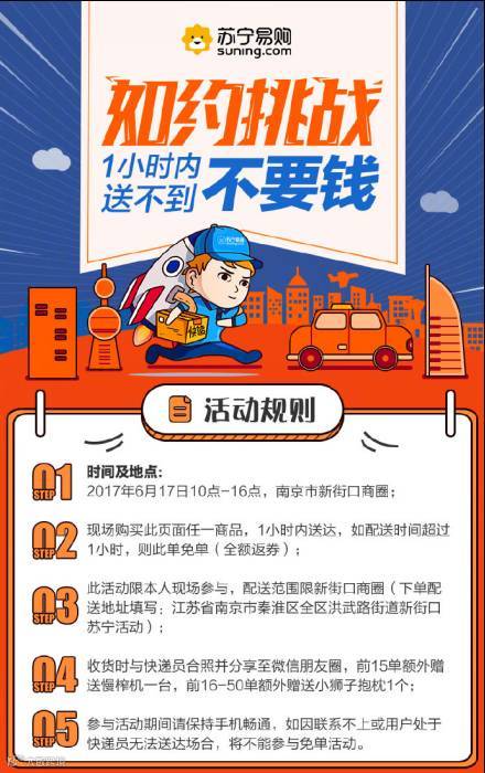 6月17号,苏宁易购在南京市新街口商圈开展“如约挑战,一小时内送不到不要钱”活动。通过前期话题推广以及游戏铺垫,此次活动参与度高,引发网友们的热议。