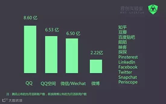 其他社交平台层出不穷,知乎已拥有1700万注册用户,月独立访客接近1亿。豆瓣,百度贴吧,陌陌等老牌平台依旧活跃,而新进的映客等视频直播平台也如雨后春笋。