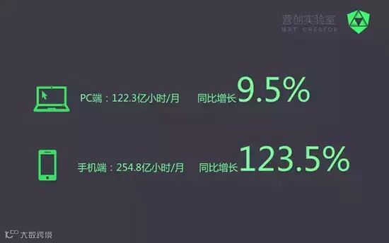 根据艾瑞咨询发布的数据来看,2015年8月中国网民PC端的使用时长是122.3亿小时,比去年同期增长了9.5%;移动端用户使用时长是254.8亿小时,同比增长123.5%。