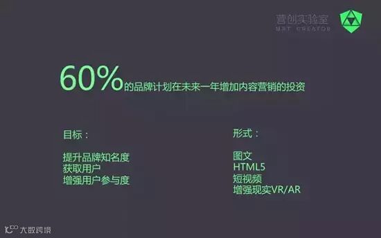 60%的品牌计划在未来一年增加内容营销的投资,他们希望达到提升品牌知名度、获取用户、增强用户参与度的目标,而内容的形式更多元化,除了常见的图文和HTML5外,短视频、虚拟现实VR和增强现实AR也是下一步重点关注和投入的方向。