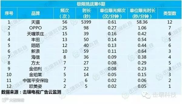 曝光量紧跟在天猫国际之后的OPPO手机与天喔柚子茶,如果说还让观众在节目中对其品牌有着较深的印象,金伯利钻石、欧美姿护肤和方太相比情节植入方式还是显得鸡肋许多。