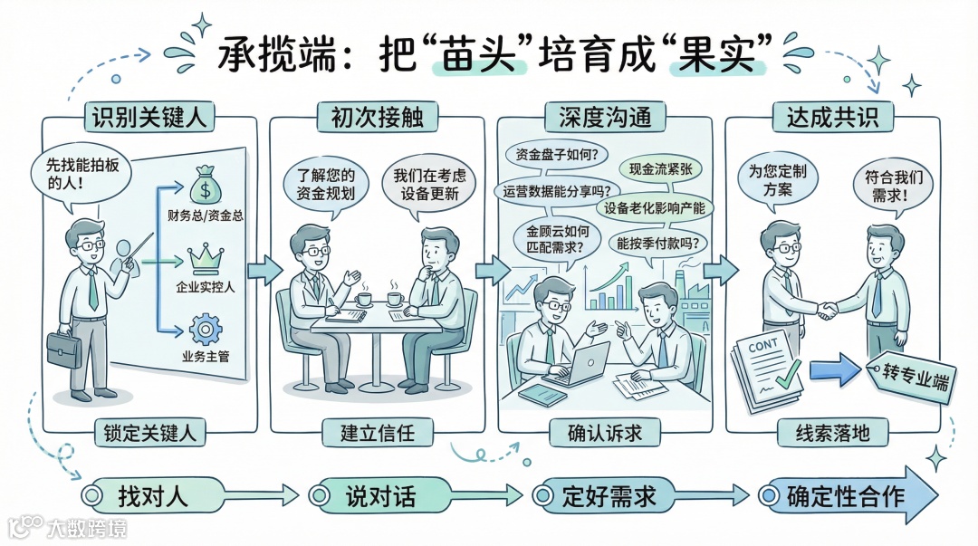 线索可能是企业“要融资”“需更换设备”“储备原材料缺资金”,甚至是“优化资金盘子”的模糊信号,而承揽端的核心作用,就是对接企业关键人,将这些零散线索转化为明确、可落地的业务诉求。简单说,线索是“苗头”,承揽端要做的就是把“苗头”培育成“果实”。