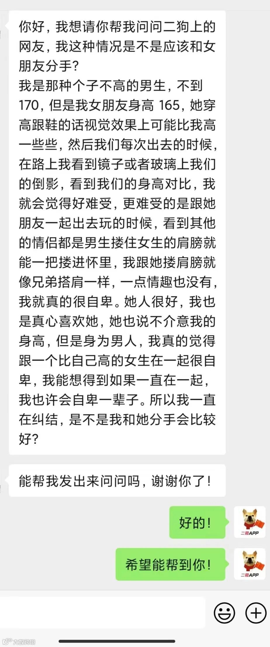 但是我是真心喜欢她,她也说不介意我的身高,但我就是过不去心里这个坎,感觉跟她在一起一辈子我都会自卑。想问问,我这种情况是不是应该跟她分手比较好?