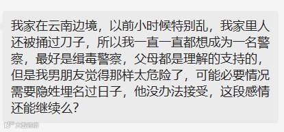 今日话题:和对象出现职业规划分歧,该不该分手呢?投稿人想要当警察,但是对象觉得不安全,希望她别去,你怎么看?